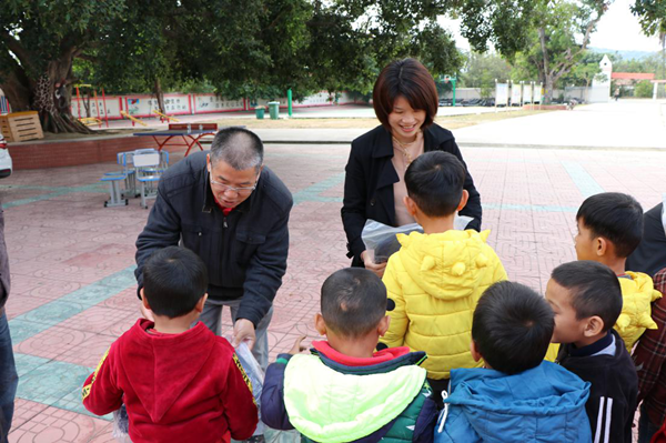 何映敏书记和王联春书记为乐妹小学生发放学习用品
