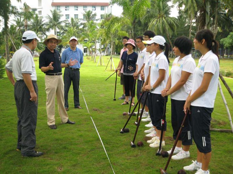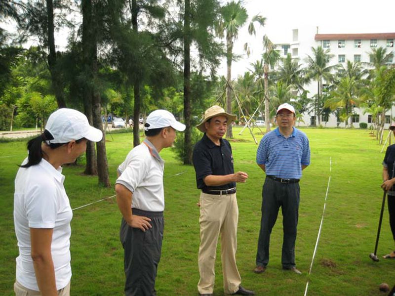 木球是海大的特色运动项目,已有十几年的发展历程,best365木球队在历年国内、国际赛事中,一直保持国内领先水平。今年7月best365木球队在山东举行的两个全国木球赛中取得了院校组男、女团体第一名和4项个人第一名,受到国家体育总局的商请,即将于今年12月代表国家赴阿曼马斯喀特参加第二届亚洲沙滩运动会。8月29日上午,校党委刘康德书记和傅国华副校长亲临best365“金桥”木球场现场,为即将代表国家出征的海大木球队加油、鼓劲,并与木球队员一起体验木球运动。